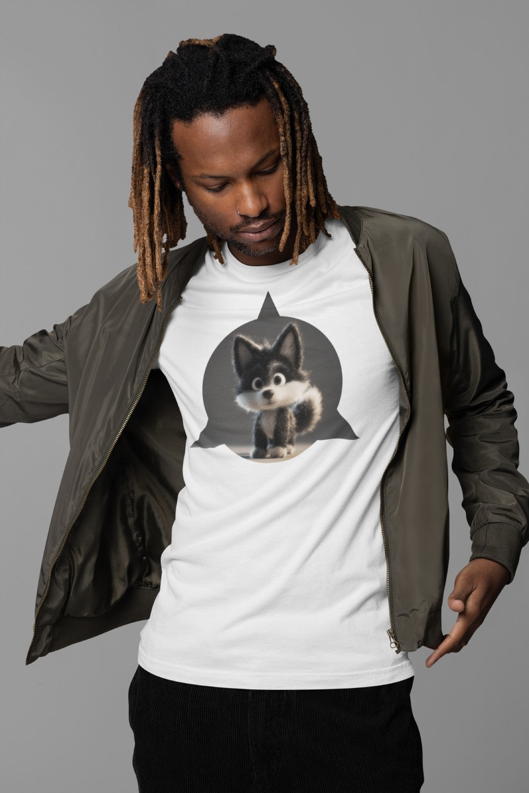This tee features a ridiculously adorable baby wolf printed on the front, wrapped in a bold geometric silhouette. It’s fluffy. It’s fierce. It’s the alpha pup of your wardrobe. Whether you're born to howl or just need a wingman for your coffee runs, this one's got your back (well, front).