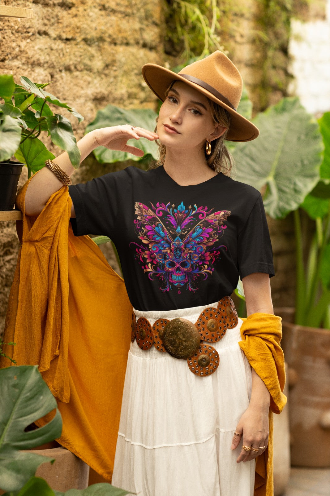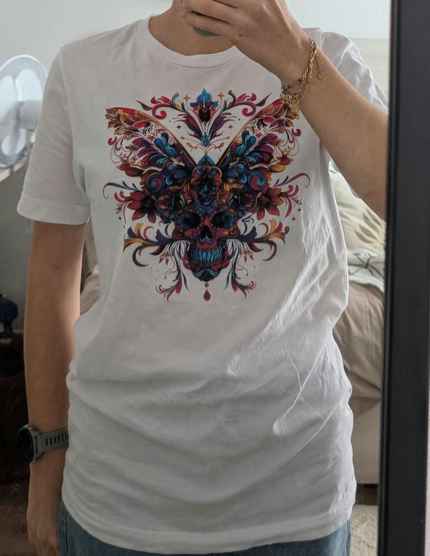 Bold, vibrant and just a bit unhinged – this front-printed tee features a trippy butterfly skull combo that screams “Don’t mess with me, I look divine doing it.” The front print dominates with swirling neon florals, skull symmetry, and a winged layout that hits hard and haunts longer. Not your average tee – this one bites back.